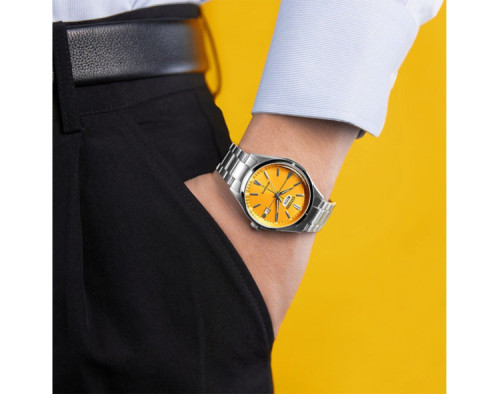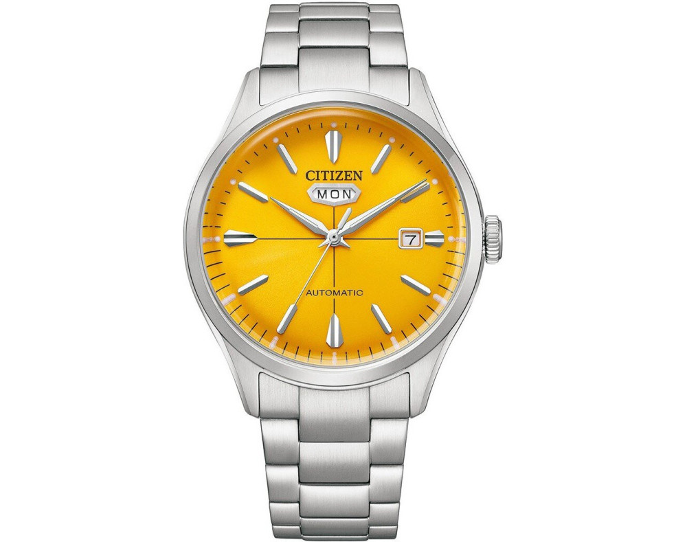 Armbanduhr Citizen NH8391-51ZE für Herren mit Mechanisch, Uhrengehäuse aus Edelstahl mit einem Durchmesser von 40 mm, Ziffernblatt Gelb und Uhrenarmband aus Edelstahl in der Farbe Silber.