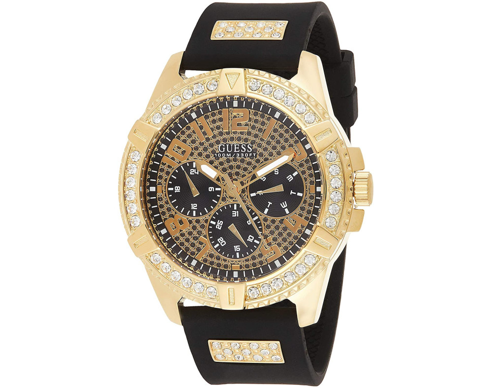 Armbanduhr Guess Frontier W1132G1 für Herren mit Quarzwerk, Uhrengehäuse aus Edelstahl mit einem Durchmesser von 48 mm, Ziffernblatt Schwarz und Uhrenarmband aus Silikon in der Farbe Schwarz.