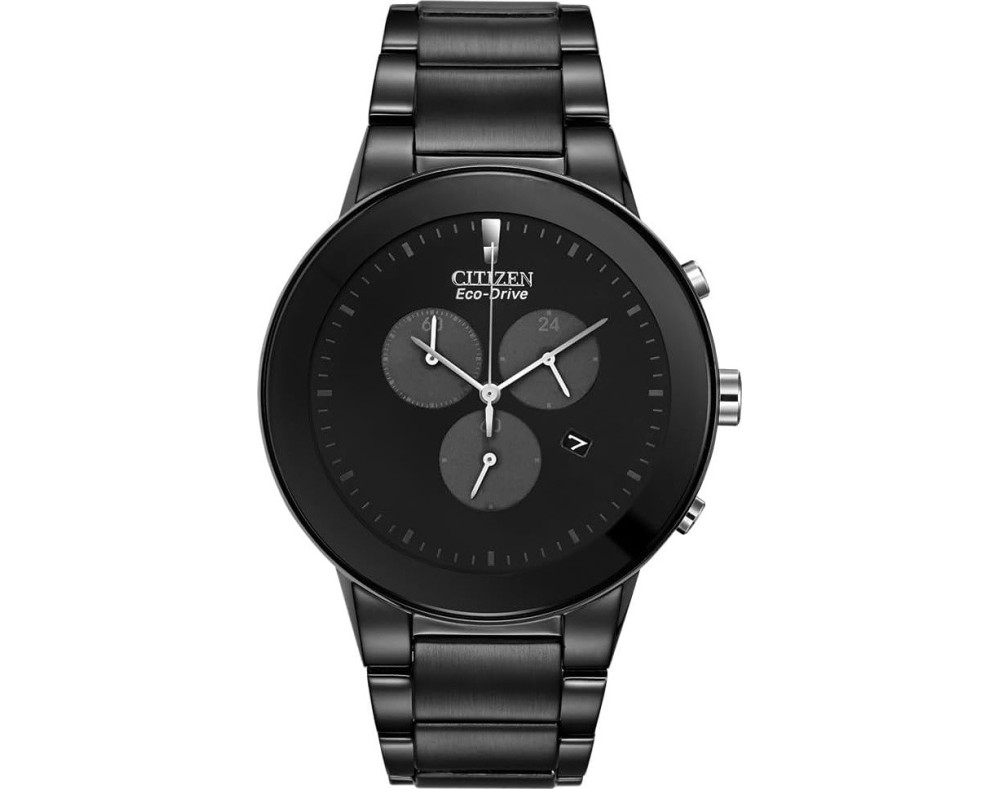 Armbanduhr Citizen Axiom AT2245-57E für Herren mit Quarzwerk, Uhrengehäuse aus Edelstahl mit einem Durchmesser von 43 mm, Ziffernblatt Schwarz und Uhrenarmband aus Edelstahl in der Farbe Schwarz.