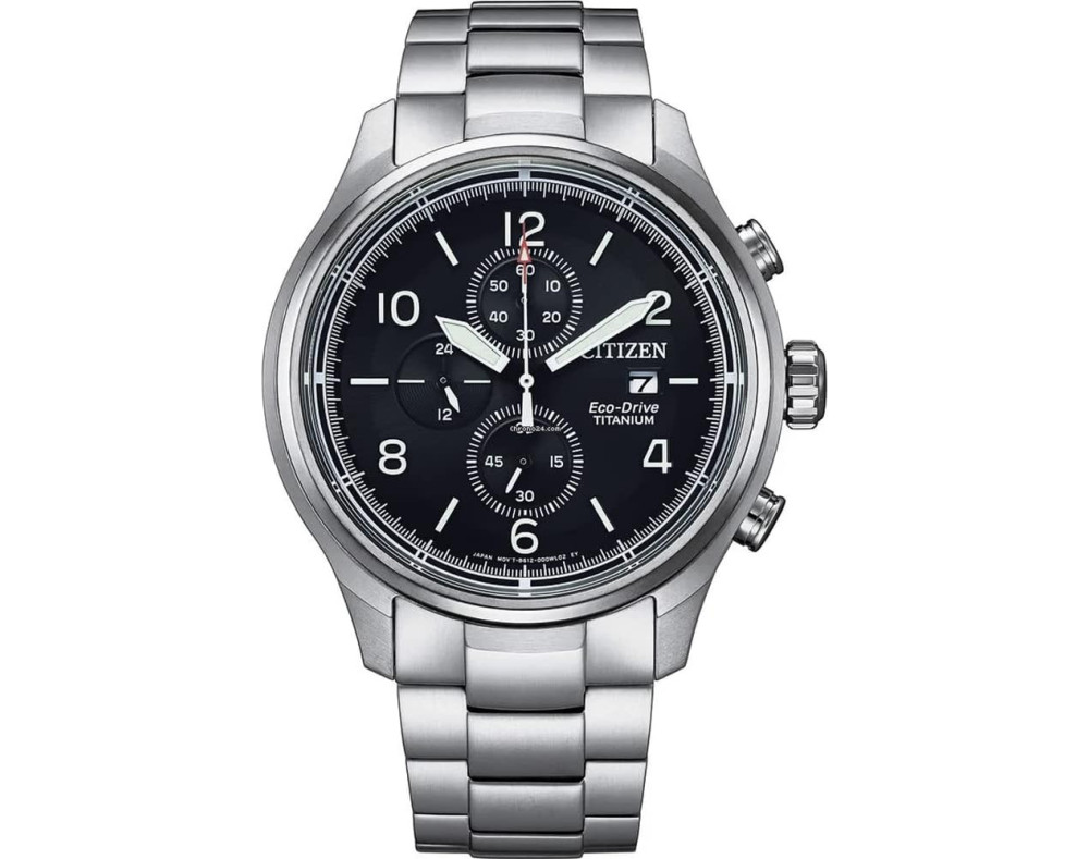 Armbanduhr Citizen Eco-Drive Super-Titanium CA0810-88E für Herren mit Quarzwerk, Uhrengehäuse aus Titan mit einem Durchmesser von 44 mm, Ziffernblatt Schwarz und Uhrenarmband aus Titan in der Farbe Silber.