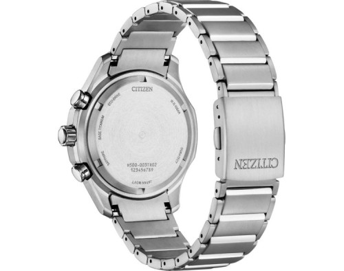 Armbanduhr Citizen Eco-Drive Super-Titanium AT2530-85A für Herren mit Quarzwerk, Uhrengehäuse aus Titan mit einem Durchmesser von 43 mm, Ziffernblatt Silber und Uhrenarmband aus Titan in der Farbe Silber.