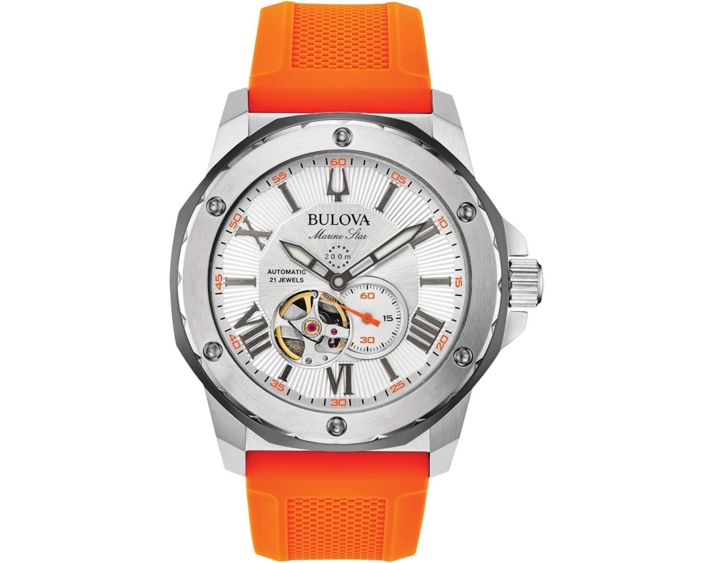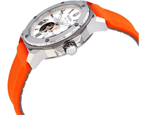 Montre bracelet Bulova Marine star 98A226 pour Homme à Mécanique, avec une boîtier de Acier inoxydable d’un diamètre de 45 mm, avec un cadran Blanc et avec un bracelet de Silicone en couleur Orange.
