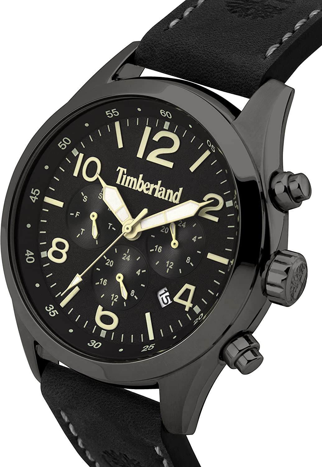 Kvarcas Vyras Rankinis laikrodis Timberland TBL.15249JSU/02 su Nerūdijantis plienas dėklu, 45 mm skersmens, Mineralinis stiklas, Juoda ciferblatu ir Juoda Oda apyranke.