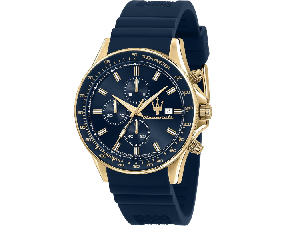 Kvarcas Vyras Rankinis laikrodis Maserati R8871640004 su Nerūdijantis plienas dėklu, 44 mm skersmens, Mineralinis stiklas, Mėlyna ciferblatu ir Mėlyna Silikonas apyranke.