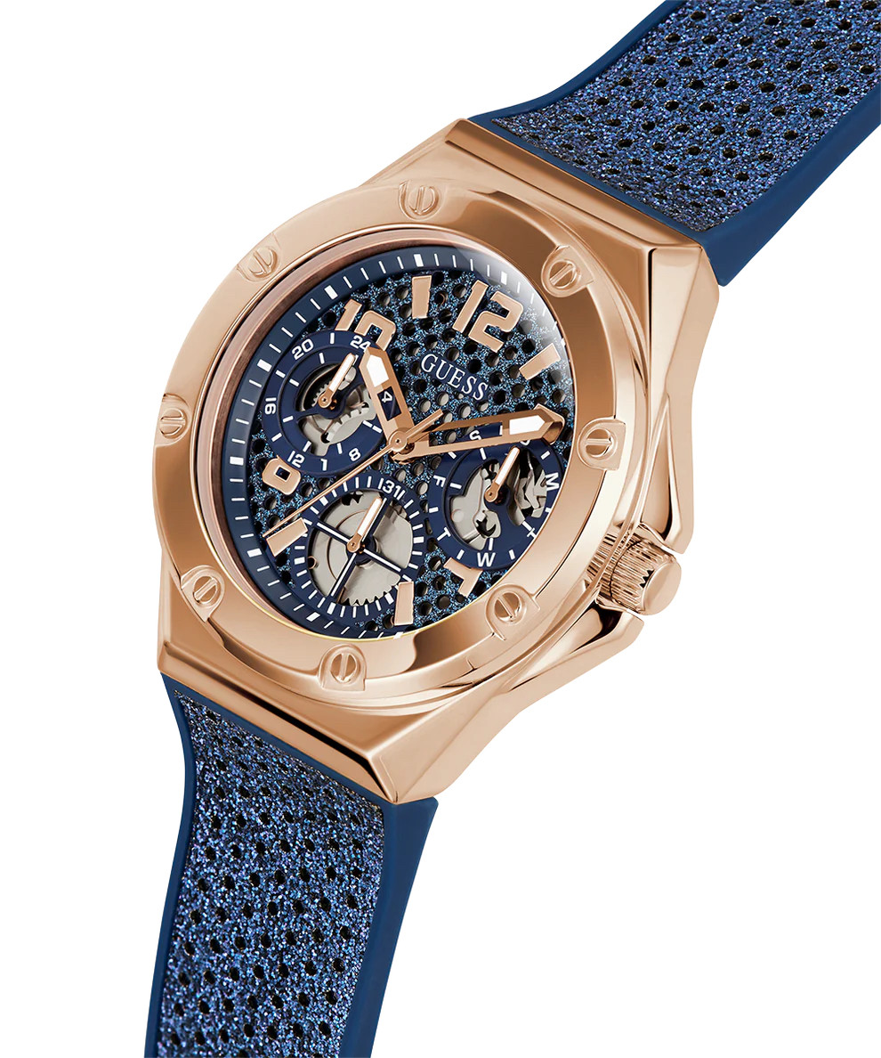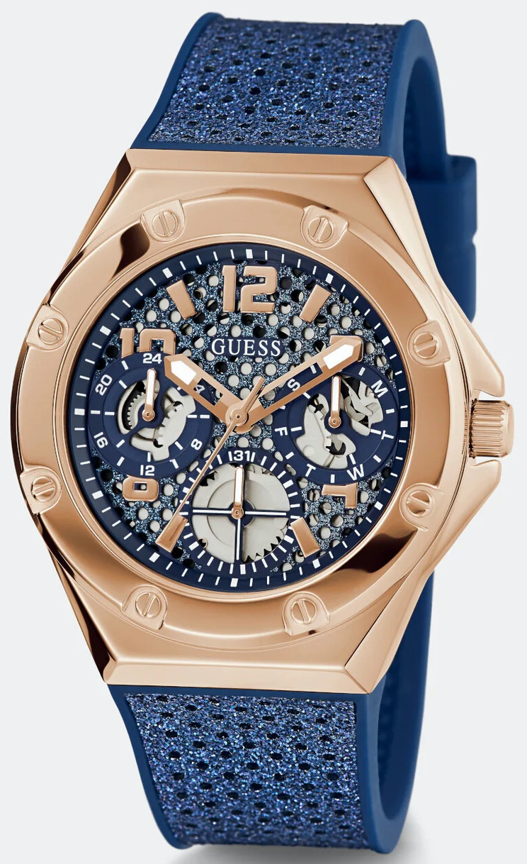 Kvarcas Moteris Rankinis laikrodis Guess GW0620L3 su Nerūdijantis plienas dėklu, 40 mm skersmens, Mineralinis stiklas, Mėlyna ciferblatu ir Mėlyna Silikonas apyranke.