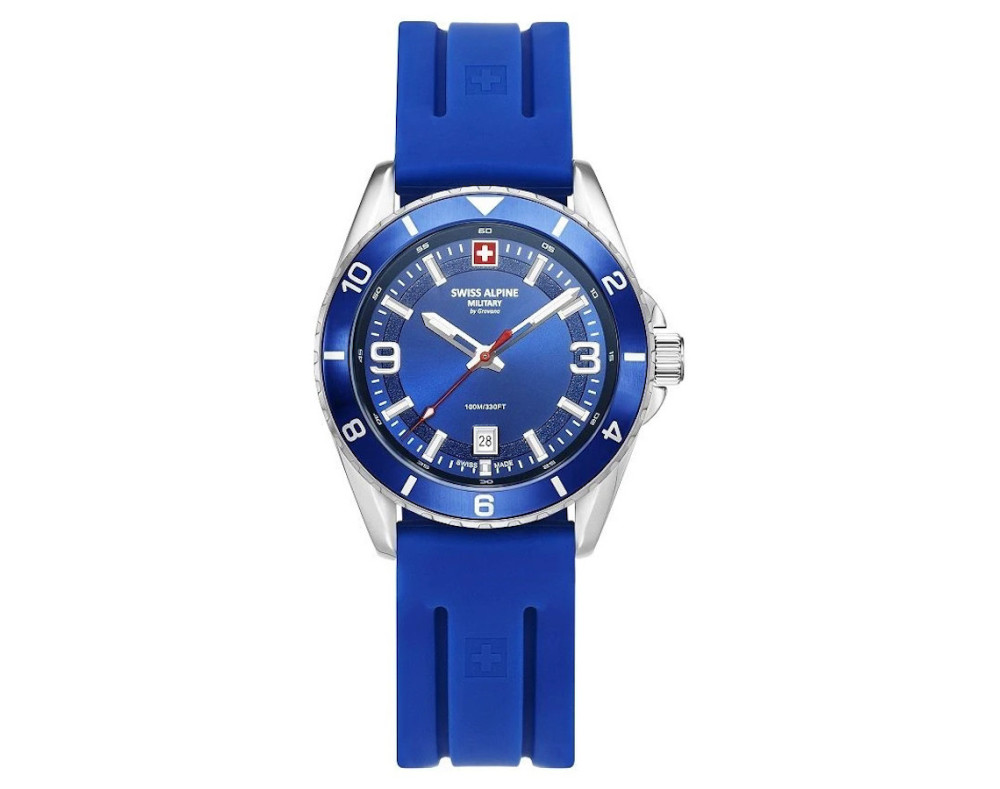 Kvarcas Vyras Rankinis laikrodis Swiss Alpine Military SAM7034.1835 su Nerūdijantis plienas dėklu, 42 mm skersmens, Mineralinis stiklas, Mėlyna ciferblatu ir Mėlyna Silikonas apyranke.