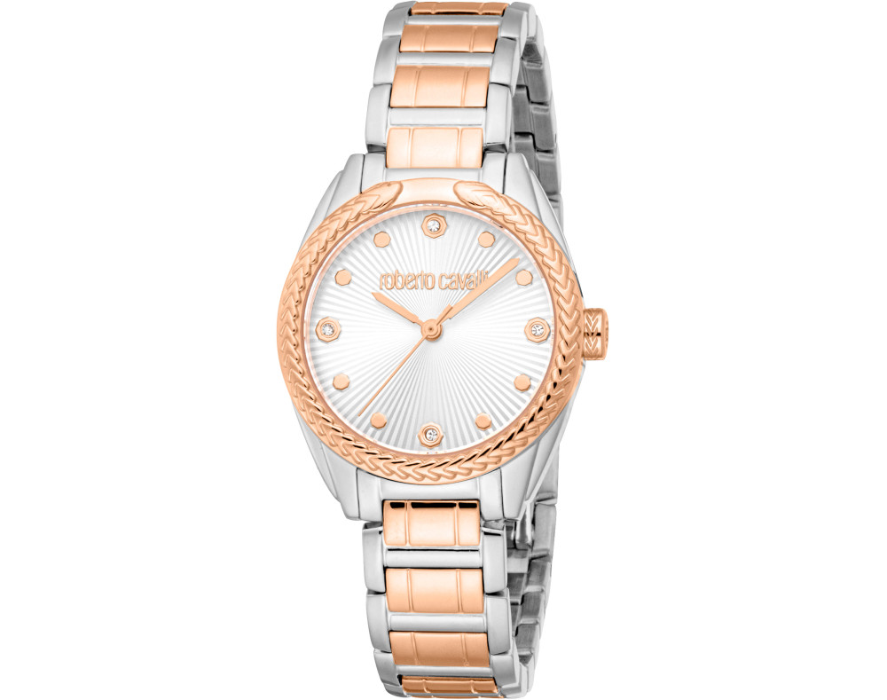 Kvarcas Moteris Rankinis laikrodis Roberto Cavalli RC5L118M0085 su Nerūdijantis plienas dėklu, 30 mm skersmens, Mineralinis stiklas, Sidabras ciferblatu ir Dviejų atspalvių Nerūdijantis plienas apyranke.