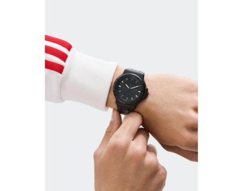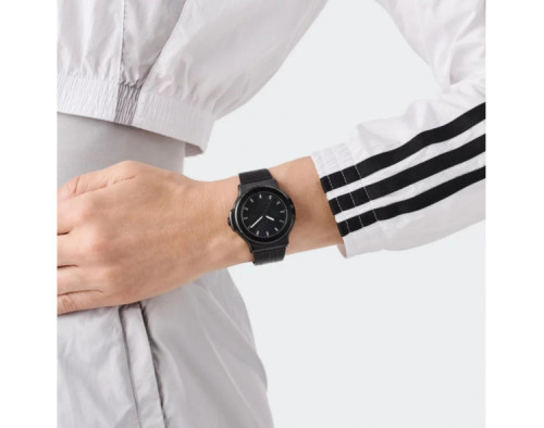Kvarcas Unisex Rankinis laikrodis Adidas AOFH25504 su Nerūdijantis plienas dėklu, 41 mm skersmens, Mineralinis stiklas, Juoda ciferblatu ir Juoda Nerūdijantis plienas apyranke.