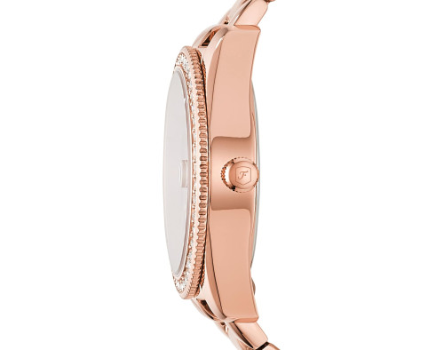 Kvarcs Sieviete Rokas pulkstenis Fossil ES4318 ar Nerūsējošais tērauds korpusu, ar diametru 32 mm, Minerāls stikls, Rozā zelts ciparnīcu un Rozā zelts Nerūsējošais tērauds siksnu.