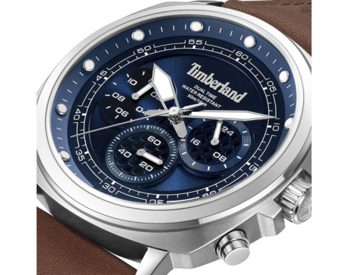 Kvarcs Cilvēks Rokas pulkstenis Timberland TDWGF0042001 ar Nerūsējošais tērauds korpusu, ar diametru 44 mm, Minerāls stikls, Zils ciparnīcu un Brūns Āda siksnu.