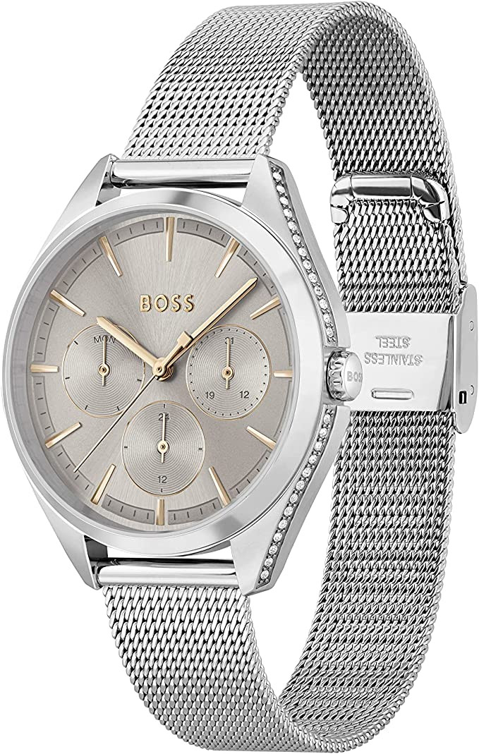 Kvarcs Sieviete Rokas pulkstenis Hugo Boss 1502638 ar Nerūsējošais tērauds korpusu, ar diametru 38 mm, Minerāls stikls, Pelēks ciparnīcu un Sudrabs Milānas krekls siksnu.