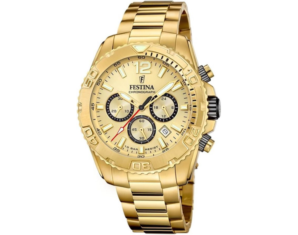 Kvarcs Cilvēks Rokas pulkstenis Festina F20684/1 ar Nerūsējošais tērauds korpusu, ar diametru 45 mm, Minerāls stikls, Zelts ciparnīcu un Zelts Nerūsējošais tērauds siksnu.