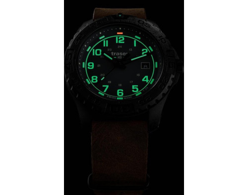 Кварц Мужчина Наручные часы Traser 109040, корпус Пластик, диаметр 44 mm, Минерал с обработкой сапфиром стекло, Синий циферблат и Коричневый Кожа ремешок.