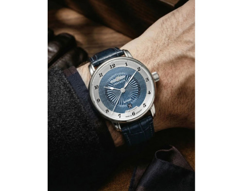 механический Мужчина Наручные часы Zeppelin 8556-3, корпус Нержавеющая сталь, диаметр 40 mm, Минерал с обработкой сапфиром стекло, Голубое небо циферблат и Синий Кожа ремешок.