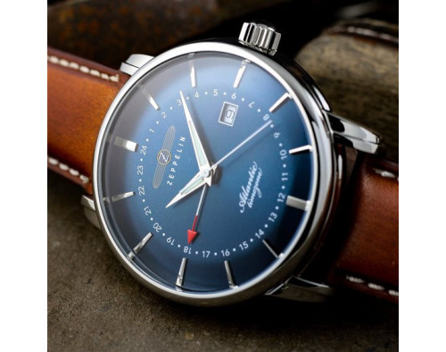 Кварц Мужчина Наручные часы Zeppelin 8442-3, корпус Нержавеющая сталь, диаметр 41 mm, Минеральная K1 стекло, Синий циферблат и Коричневый Кожа ремешок.